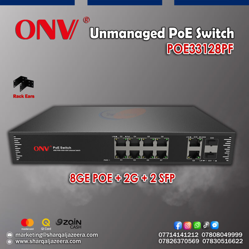 It contains 8 RJ45 ports (10/100/1000). These ports support POE, which (supplies power to devices) with a voltage range (44V-57V). The power capacity of each port is 30 watts, and the maximum power output capacity is 120 watts.